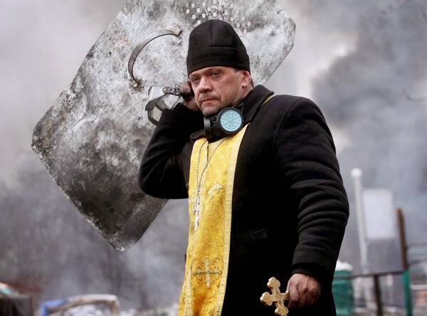 During the recent events at Kiev the Priests of the Eastern Orthodox Church have been showing everyone how being a priest ought to be done. They are operating at peak excellence and it is inspiring for us all. Even the Times, which hates Christians, has been printing pictures which elicit admiration for the priests and which do a lot to strengthen the faith of many of us. These men are real shepherds and bravely stand among their flock as priests should. Look at this one here: